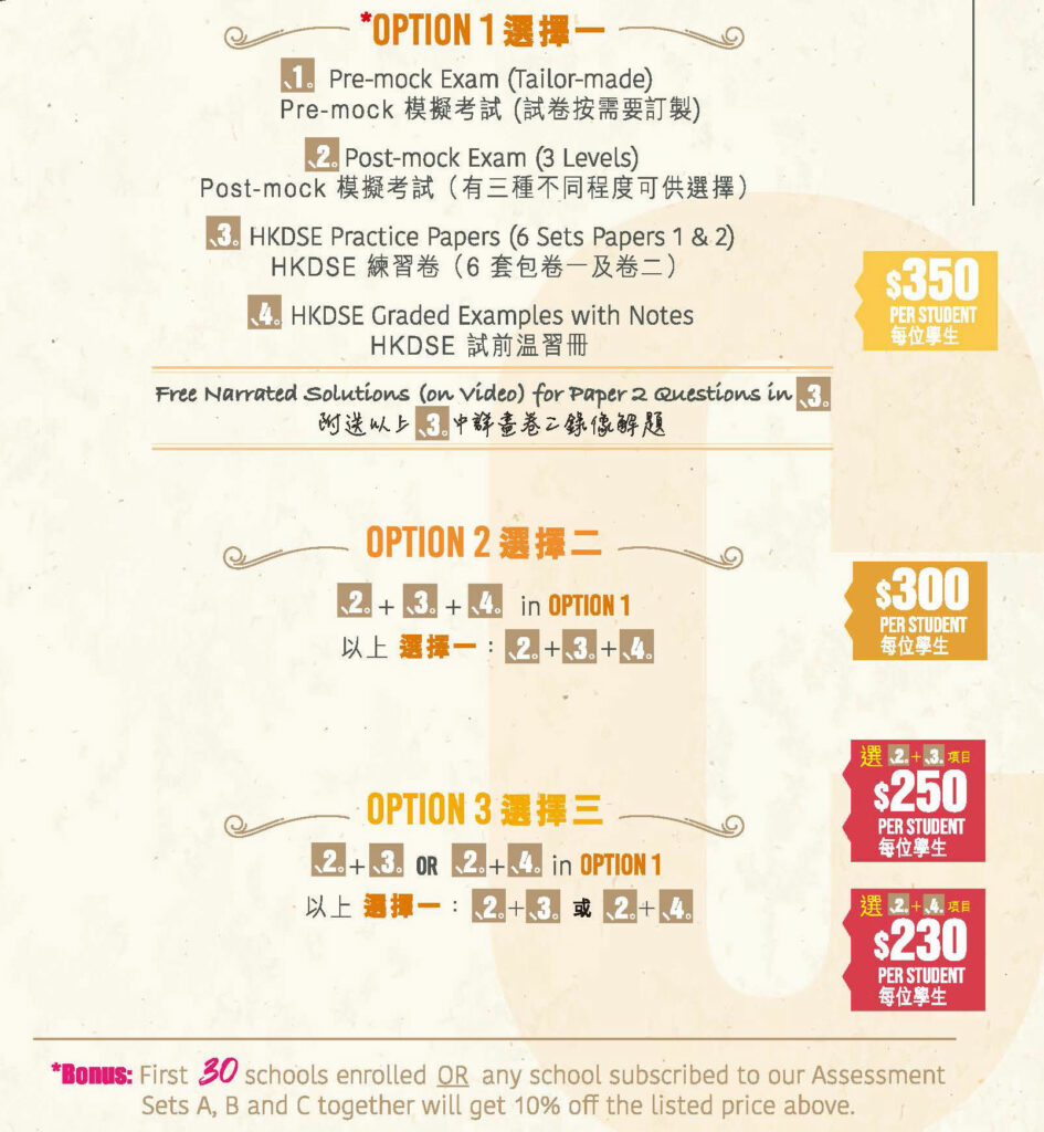 Our F.6 Mathematics Compulsory Part Mock Examination will be conducted during December 2021 to March 2022. Each year we have over ten thousand candidates participating our examination, making it the most popular in Hong Kong. As we have a large base of candidates, we are able to provide reliable comparative reports of the performance of candidates. This information can help the candidates to have a more effective preparation for their HKDSE.